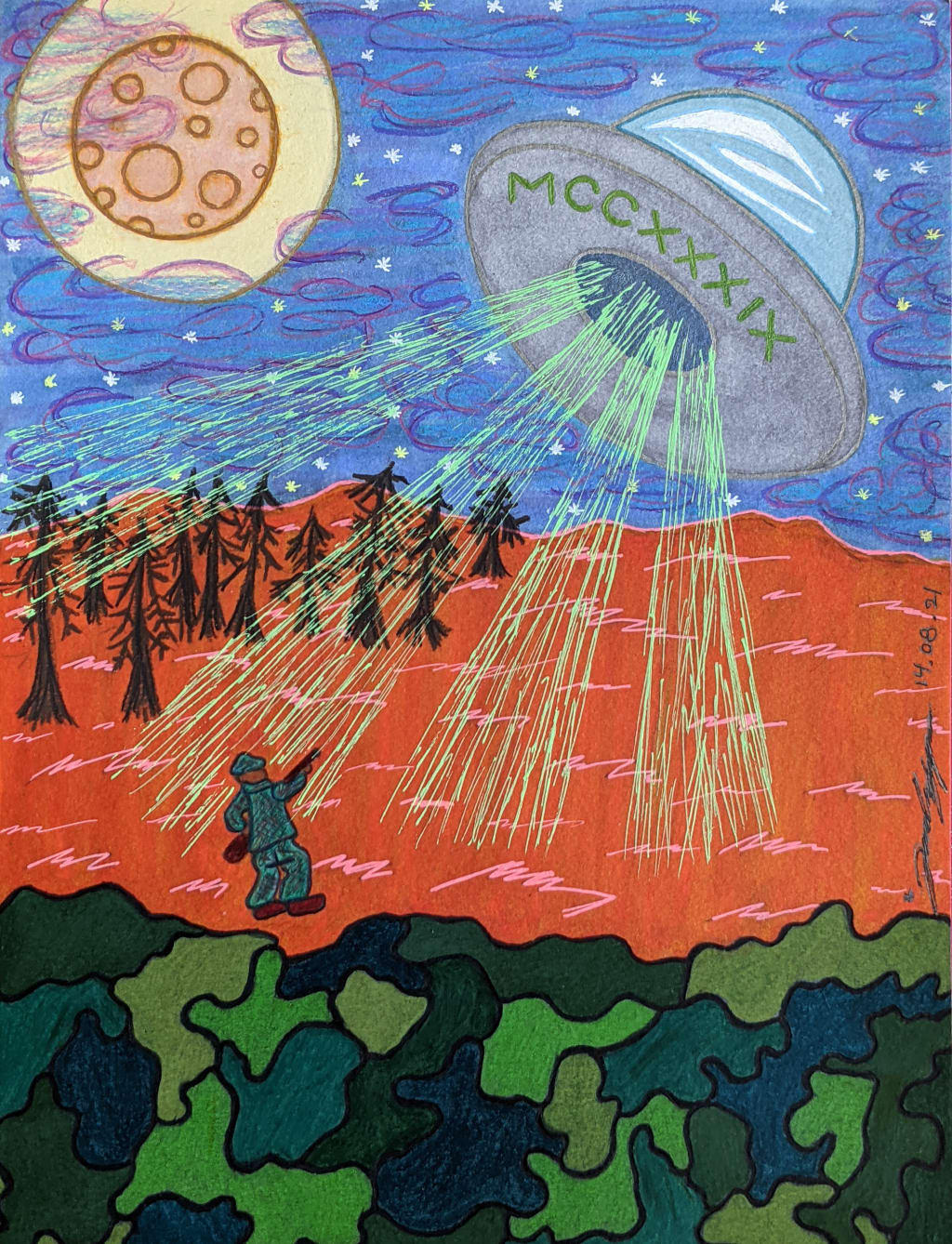 I am kneeling down bottom to heels under the command of a flying saucer's will— of this psychoanalytic thrill, looking as though it might kill. Captured under its green light, the challenge was considerably undeniable; now I'm held up in its abode, that appears maniacal. My transition has placed me in this position, therefore I am reliable. Only God knows where this trip goes. Maybe I'm being taken to a home I didn't know. I guess this is what my prayers suggest, am I being rescued from my own mess? Or meeting my test— oh well, as I continue being lifted up into the empyrean being held by my chest. I can no longer stress.
