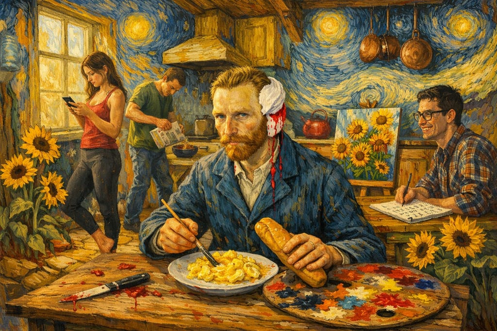 "Vincent, mate, the walls again?" Jamal said one Tuesday morning, stepping over a palette knife crusted with cadmium yellow. A fresh smear trailed from the baseboard to the ceiling, where sunflowers twisted in impossible spirals. Vincent looked up from his canvas on the coffee table, a swirling night sky that seemed to pulse if you stared too long. His right ear was bandaged anew, the gauze spotted with rust-colored stains that dripped steadily onto his smock.