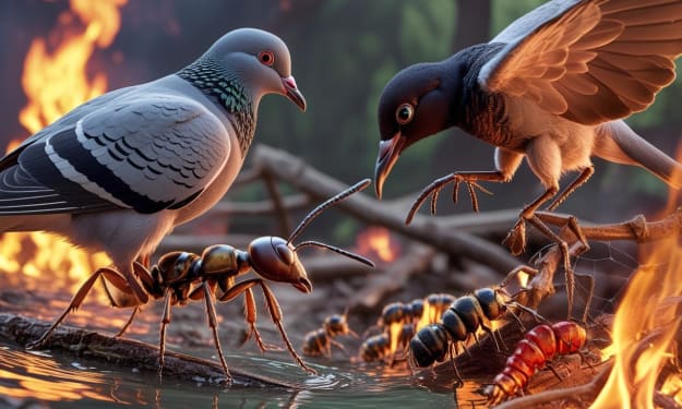 The Grateful Ant and the Helpful Pigeon. Content Warning. AI-Generated.