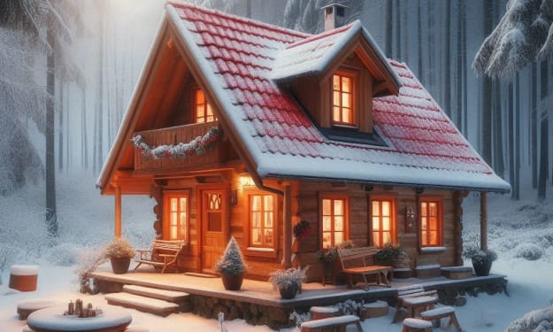 There it was, the cozy, small, red-roofed cottage nestled so peacefully in the fallen snow. The atmosphere was as thick as gelatin, and the stillness of the scene suggested all was well — that all residing within the cottage were happy and content. That they were fine just staying put in their little winter paradise.