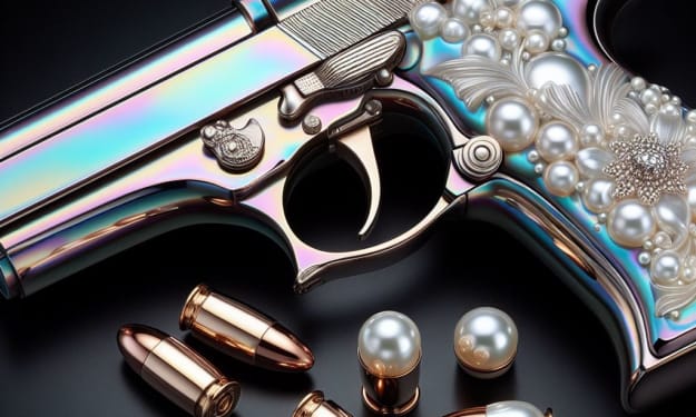 Pearls are from irritation. Ask any oyster. Or when any guest outlasted their welcome. And I'm irritated. The irony is that while I use this concentric-layered aragonite and calcite to sequester my irritation, it just happens to be on the end of a pistol. To settle my discontent that began small as a grain. That milky white irony is now firmly within my grasp: purposeful, 45-calibred, and well-aimed. It is an iron-clad clasp that is clammy and sweaty.