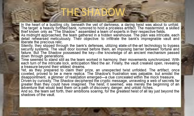 In the heart of a bustling city, beneath the veil of darkness, a daring heist was about to unfold. The target: a heavily fortified bank, rumored to hold a priceless artifact. The mastermind, a skilled thief known only as "The Shadow," assembled a team of experts in their respective fields.