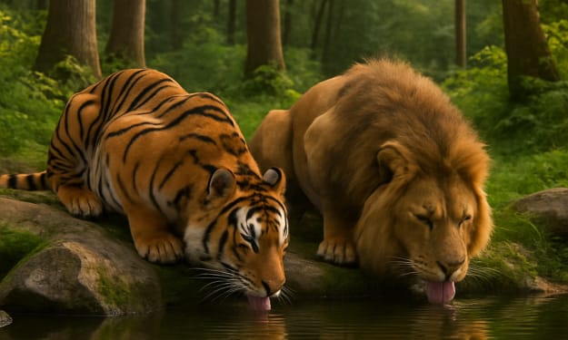 The Pact by the Lake The sun filtered gently through the towering trees, painting the forest in hues of gold and green. The air was thick with the scent of moss and blooming wildflowers, and somewhere nearby, a stream trickled its way into a still, glistening lake. At the water’s edge, two magnificent beasts crouched in silence— a Bengal tiger and an African lion.