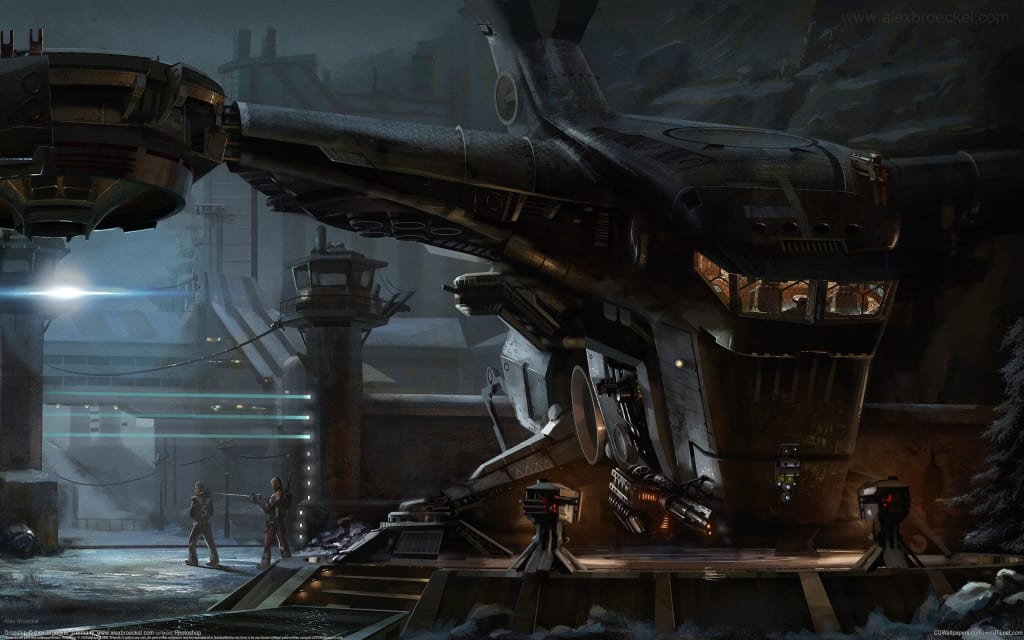 Outside, the saddest group of police troopers waited, standing forebodingly in a half circle around my ship. The one in the middle appeared less ragged than the rest and I assumed he was the man in charge. I stopped at the bottom of the ramp and stared at the man, carefully taking in everything my peripheral vision could grasp. After a thorough assessment of the men and the weapons they carried, I leaned over to rest my shoulder on the ramp pillar and portrayed a more relaxed stance. Still minding my peripherals, I noticed several of the men exchange curious glances.