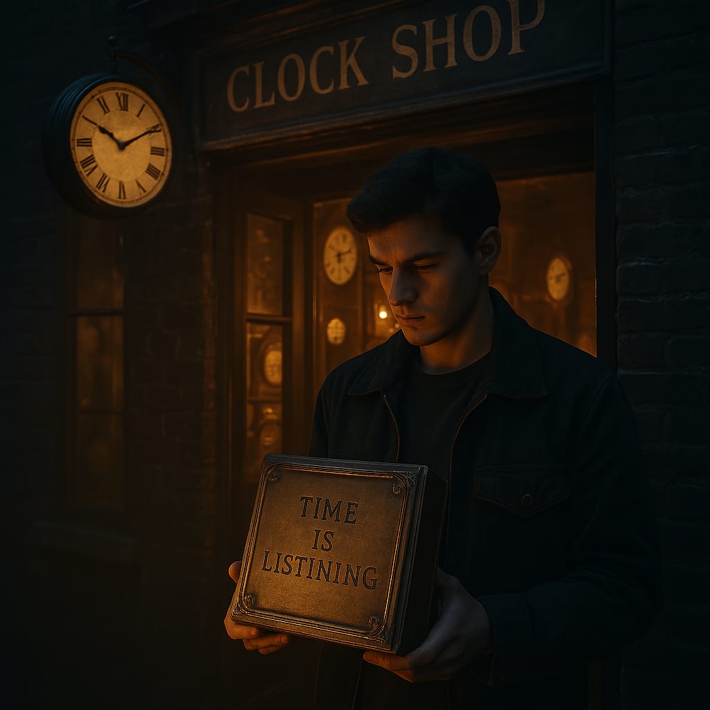 Inside the shop, hundreds of clocks ticked in eerie harmony—grandfather clocks, wristwatches, cuckoo clocks—all frozen in their own eras, yet ticking as one. The air pulsed, like the heartbeat of time itself.