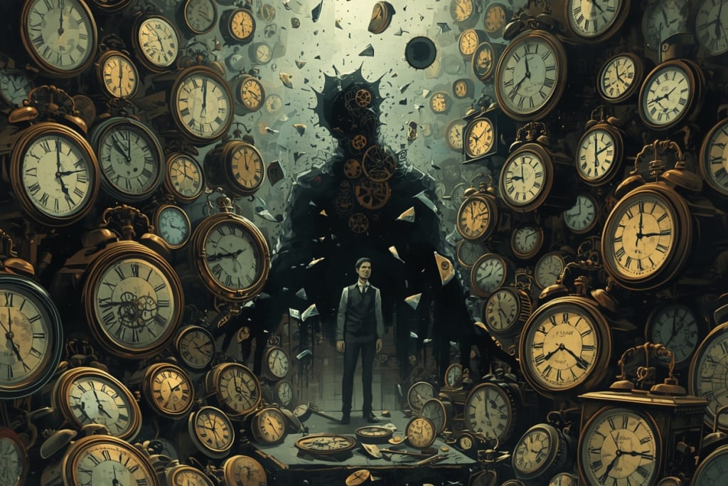 The clocks began to spin wildly, their hands slicing through time itself. Pages of his unwritten stories fluttered across the floor, filled with words he had never written yet somehow recognized.