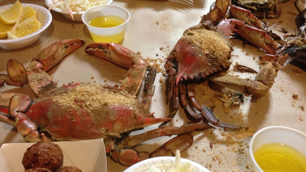 Today is the annual Thompson family crab feast always held at their favorite crab house, located right on the Chesapeake Bay at their usual outside space, a picnic table with a postcard view of the bay. The briny, salty breeze of the water complimented the aroma of crab seasoning and yacht rock music piped through speakers hidden in large planters overflowing with canna lilies, petunias, and geraniums all in the colors of the Maryland flag.