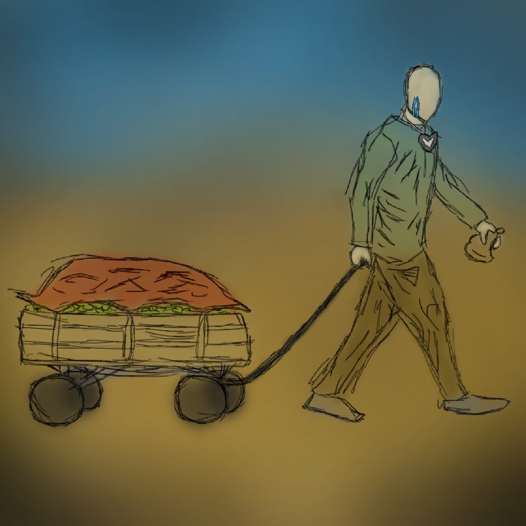 This was the sixth journey he had undertaken this year, and the thirteenth in total. Wagon laden with loot, he would often disappear from the village to seek some queer associates that he would barter with. Two or three days later, he would arrive in a magnificently painted horse-cart pulled by two onyx horses. Much to the village’s delight, it was usually overflowing with ripe fruit, choice meats and leafy vegetables, crisp baked goods, delicately wrapped cheese, a few bottles of vintage spirits and sometimes even tins of candy for the children. Arthur was an important man, and his journeys kept the village comfortably fed. Not much of a village, though. Blasted to hell. We have crumbling stone trees and ashen backyards. It did have a certain comfort, though. Nobody came or went, save for him. There are maybe two dozen families, and another dozen just waiting to die. He twisted his mouth and stopped walking for a moment. The journeys were wholly unpleasant, and it irked him that his boons fed the useless. That’s work for the Chief, though. I just get the stuff. He resumed his pacing, a stiff, brisk gait with his right arm trailing behind him. There was no comfortable way to pull that wagon, so he went with what was fastest.