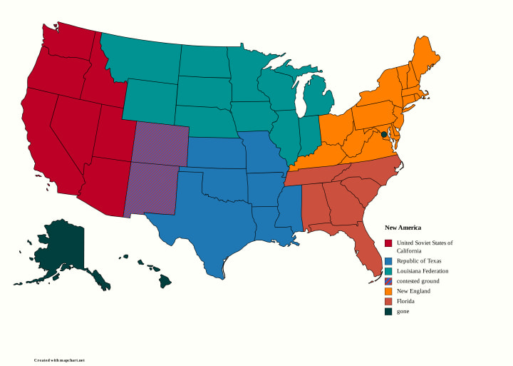 Texas and California Grew in size by swallowing their neighbors in the first 3 years. The Republic of Texas (R.T) and The United Soviet States of California (U.S.S.C) rivaled each other in the efforts fighting over Colorado and New Mexico still rages with no end sight.