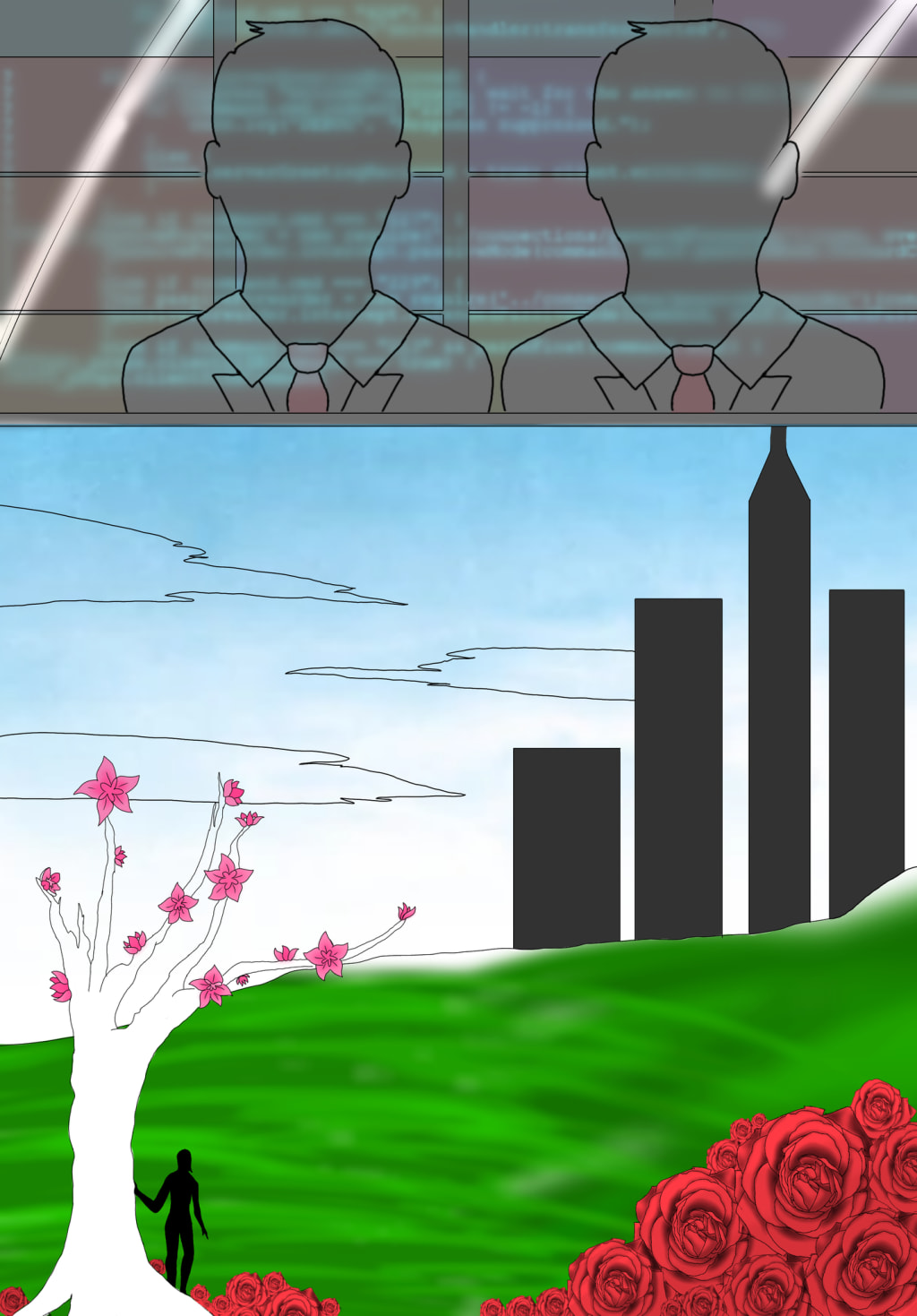 The two identical men walked over to look through the glass; it was not them enclosed, but her. The large white chamber, nearly eight feet long, stood four feet high to accompany the inner machinery and the woman inside it. They looked at each other without saying a word because their thoughts fluttered seamlessly between their heads.