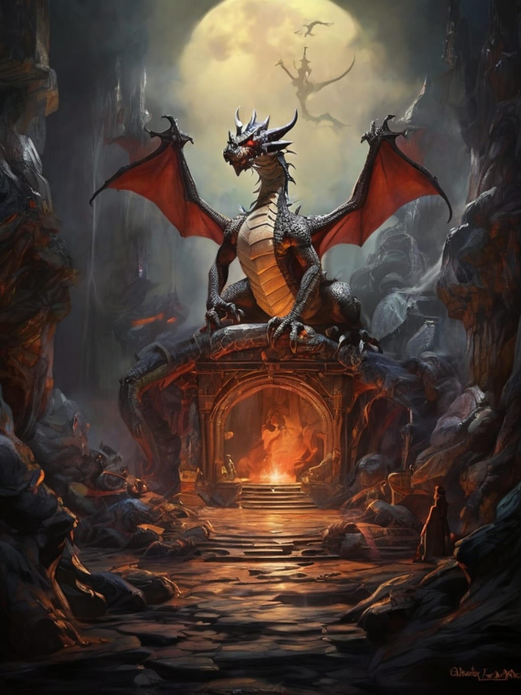 Suddenly, a deep rumbling filled the chamber, and Drakus emerged from the darkness—a colossal creature with scales as black as midnight and eyes that glowed like embers.