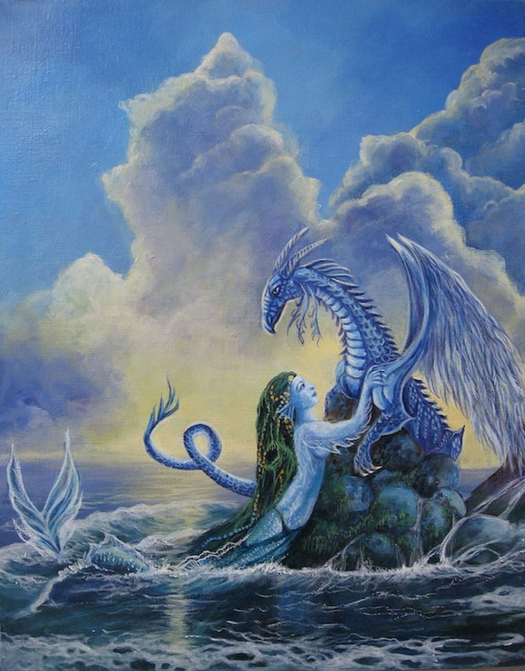The Little Mermaid Girl cowers and swims to the opposite side of the lake from the Dragon. Maybe she does not understand me, she thinks to herself. She is very young.