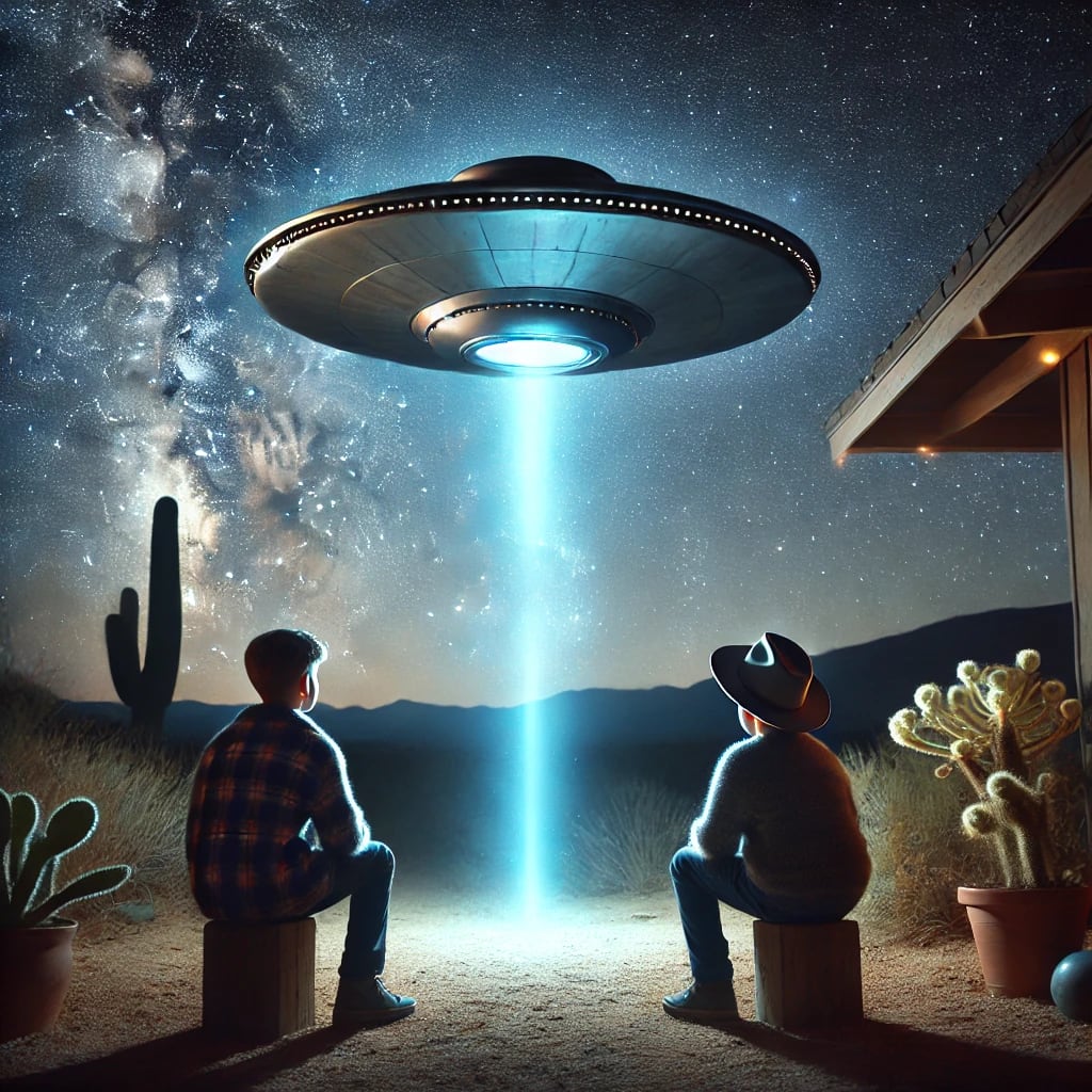A streak of light zipped across the heavens, stopping dead center above them. It hovered silently, a metallic craft with a liquid-like surface that rippled as it reflected the stars. The brothers froze.