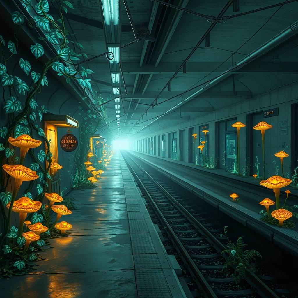 It appeared to be a subway station, but one long abandoned by humanity. The concrete walls and floors were overtaken by a riot of plant life—not the typical moss or weeds that might invade an abandoned structure, but something otherworldly. Vines with translucent leaves pulsed with an internal blue-green light. Fungi resembling delicate glass sculptures emitted a soft amber glow. The entire platform seemed alive with bio-luminescence, casting the abandoned ticket booths and benches in an ethereal light.