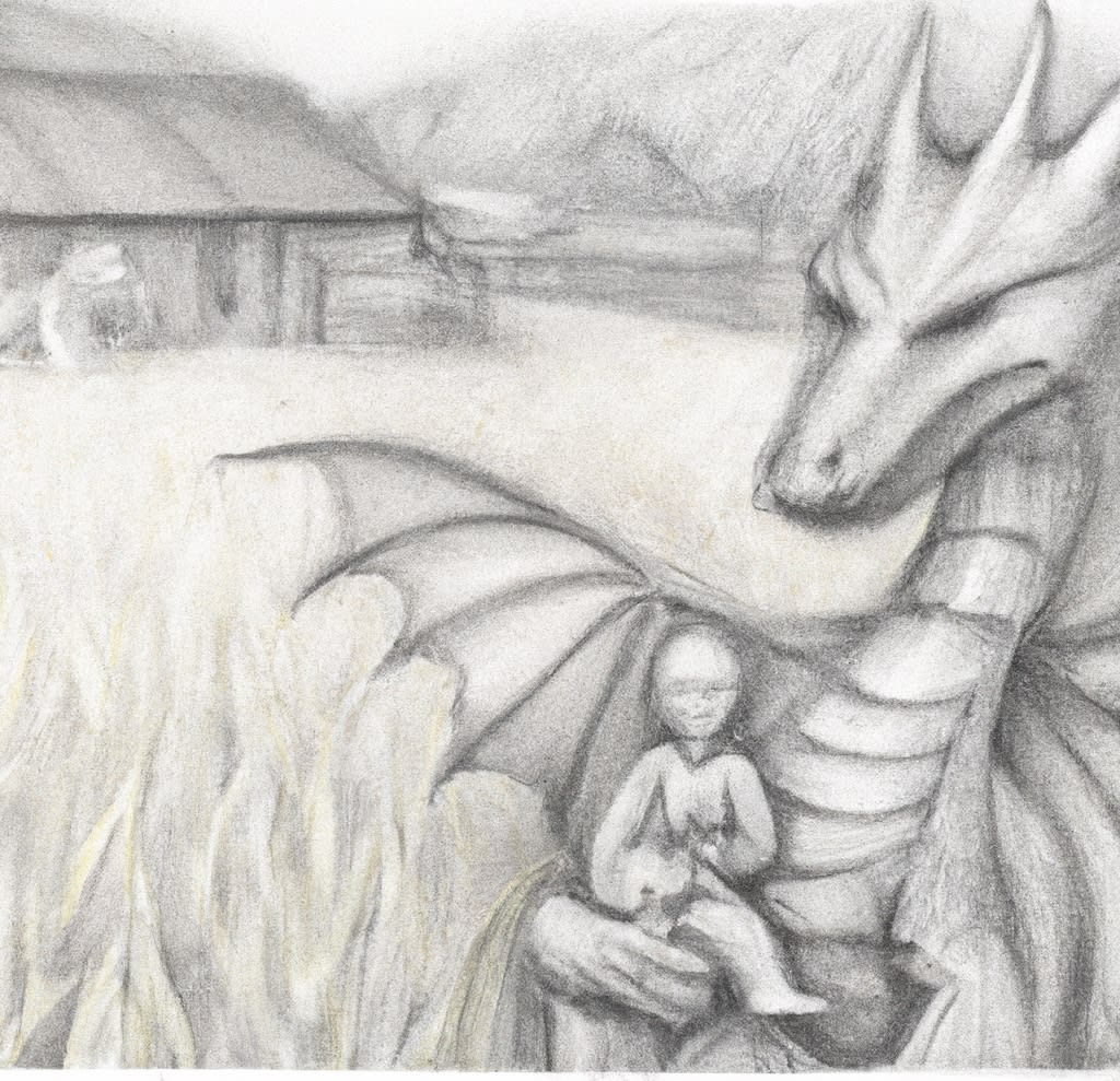 When the dragon came to his senses, the boy started to cry once more. The dragon returned to admire him, widening the sharpness of his eyes to a calming state. In his front hands, the dragon picked up the baby boy and flew off into the air. Flying out over the Whispering Woods, taking him far from the dangers and leaving the past in wake.