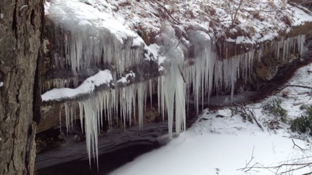It was a demon sent from Hell. He ran. It followed. He heard a crack in the ice. He screamed then turned around. The hand was reaching out of the ice. He ran, looked back. The snake-like body slithered towards him. His feet slipped and slid. The demon gave chase. The ice cracked under his feet. He fell in but was near the edge. He grabbed a branch of a Winterberry bush and pulled himself up. Terrified, he ran back to the train station. The next day he came back with the forest rangers. No footprints in the snow. No breaks in the ice.