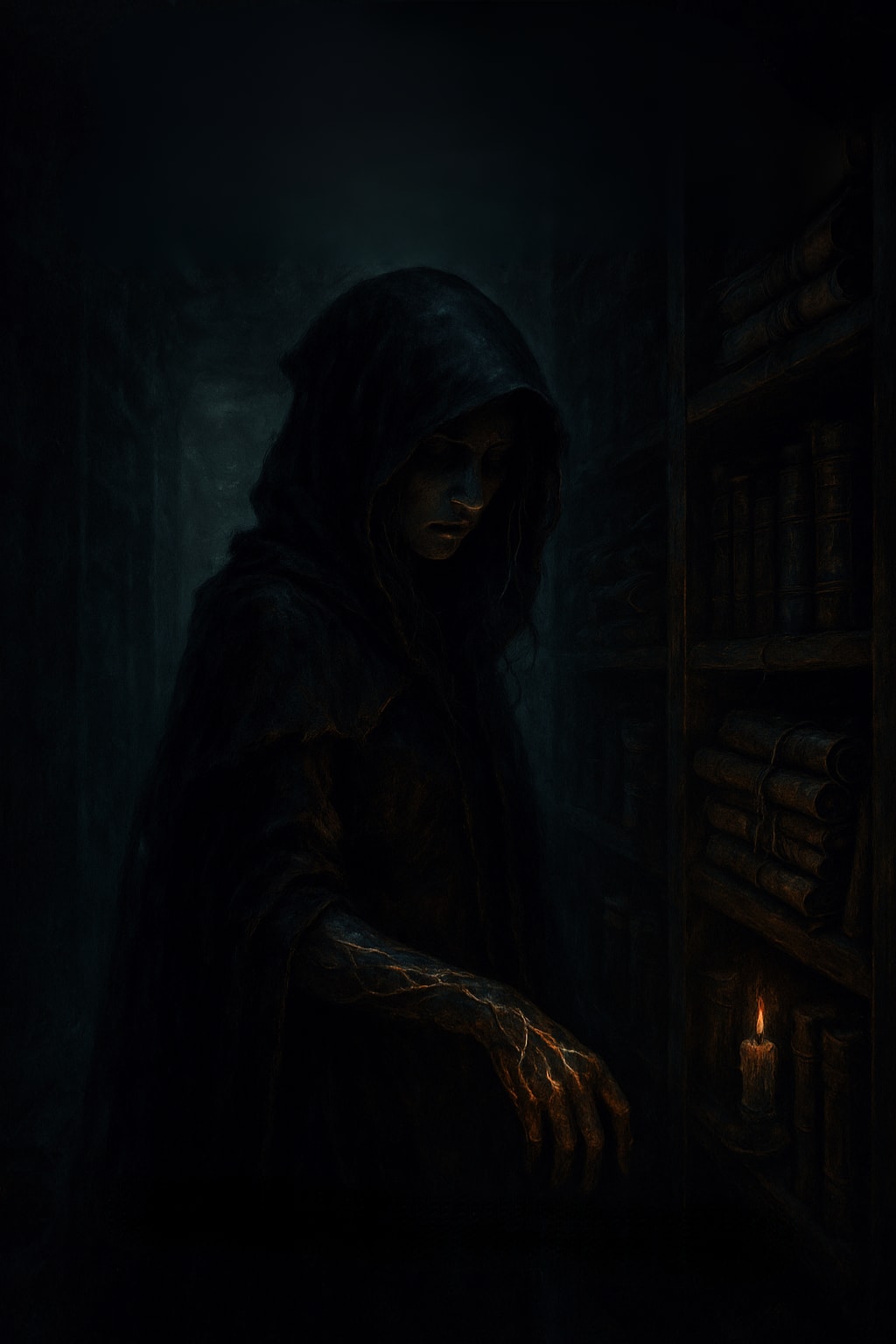 She stands and peels back her glove. Beneath, her hand pulses faintly with gold-veined patterns, like marble soaked in starlight.