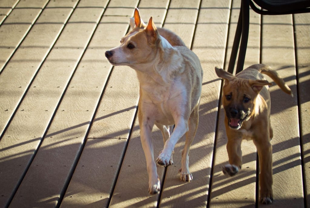 During the days, while her mom and dad would work, she would encourage Zeus to bark with her at the many noises they heard. This usually happened when her mom would work and need to get up and take a break from the computer.