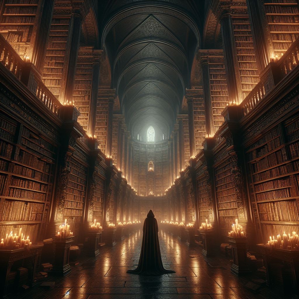 In the heart of the ancient forest, where the whispers of the trees dance in the wind and the shadows stretch farther and deeper, lies a place lost to time: a sanctuary of knowledge beyond mortal comprehension. This is a shadow library, a repository of forgotten and forbidden secrets, guarded in a mysterious library, a creature as old as the stars.