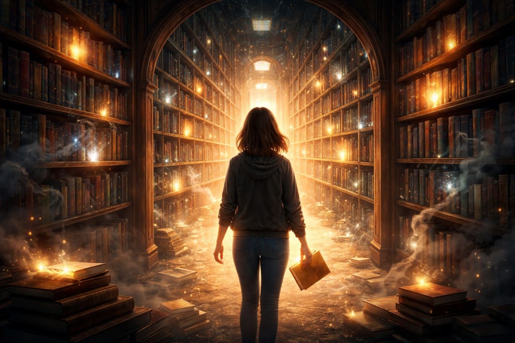 There is a library most people never hear of, hidden between shifting streets and alleyways that seem to appear only when you need them. They say it contains every book ever written about lives that could have been—the ones you never lived, the choices you never made, the paths you turned away from. Few have seen it and returned unchanged. I found it by accident, or perhaps by design.