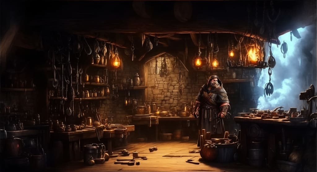Milo’s small feet swiftly navigated the uneven terrain as he dashed and darted through the narrow cobblestone streets, shoving past shouting vendors and bustling clusters of people to his father’s blacksmith shop. He called out to his father with a mixture of eagerness and urgency, finally reaching the blacksmith’s ears. The man, a towering figure, turned to face his son, his soft brown eyes settling upon the boy.