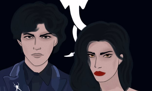 She stares hard at him, thick brows furrowed as if she's waiting for them to cut him open just so she can explore the mechanisms of his being. She catches his gaze and glances down at the spiders. With a simple stamp of her foot, she crushes the creatures until their white blood oozes beneath the soles of her boots.
