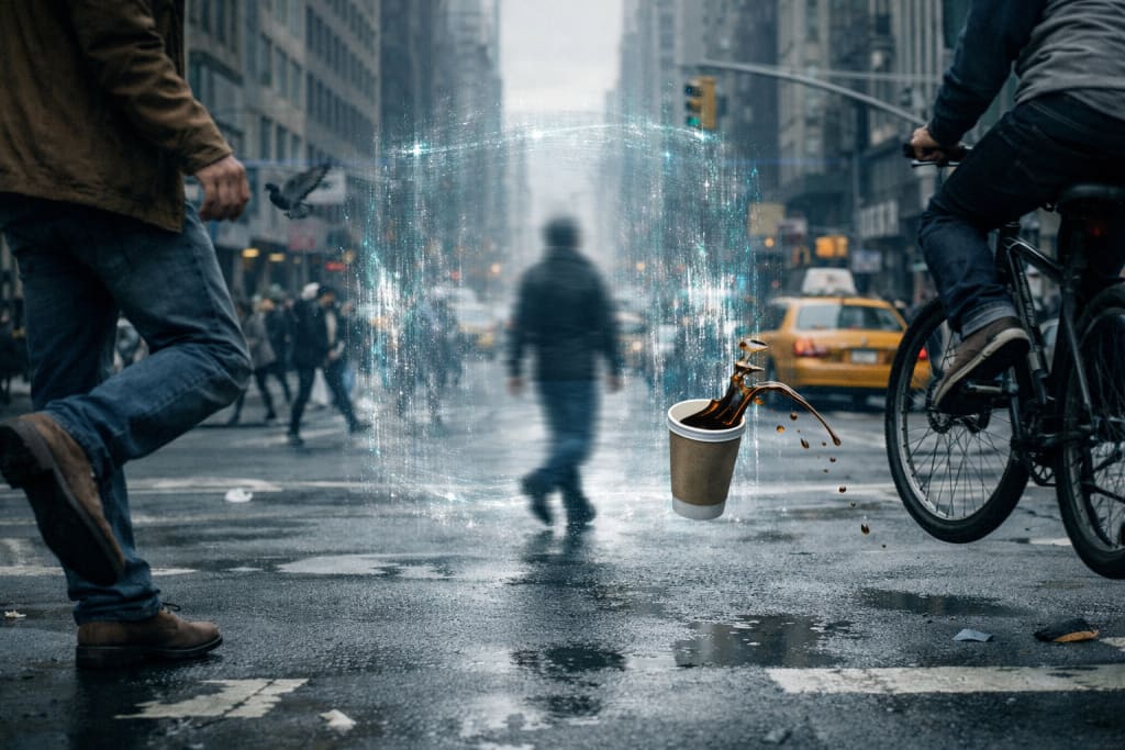 Sound crashed in—voices, engines, wind, laughter, chaos. Coffee spilled to the ground. The child finished laughing. Traffic resumed as if nothing had happened.
