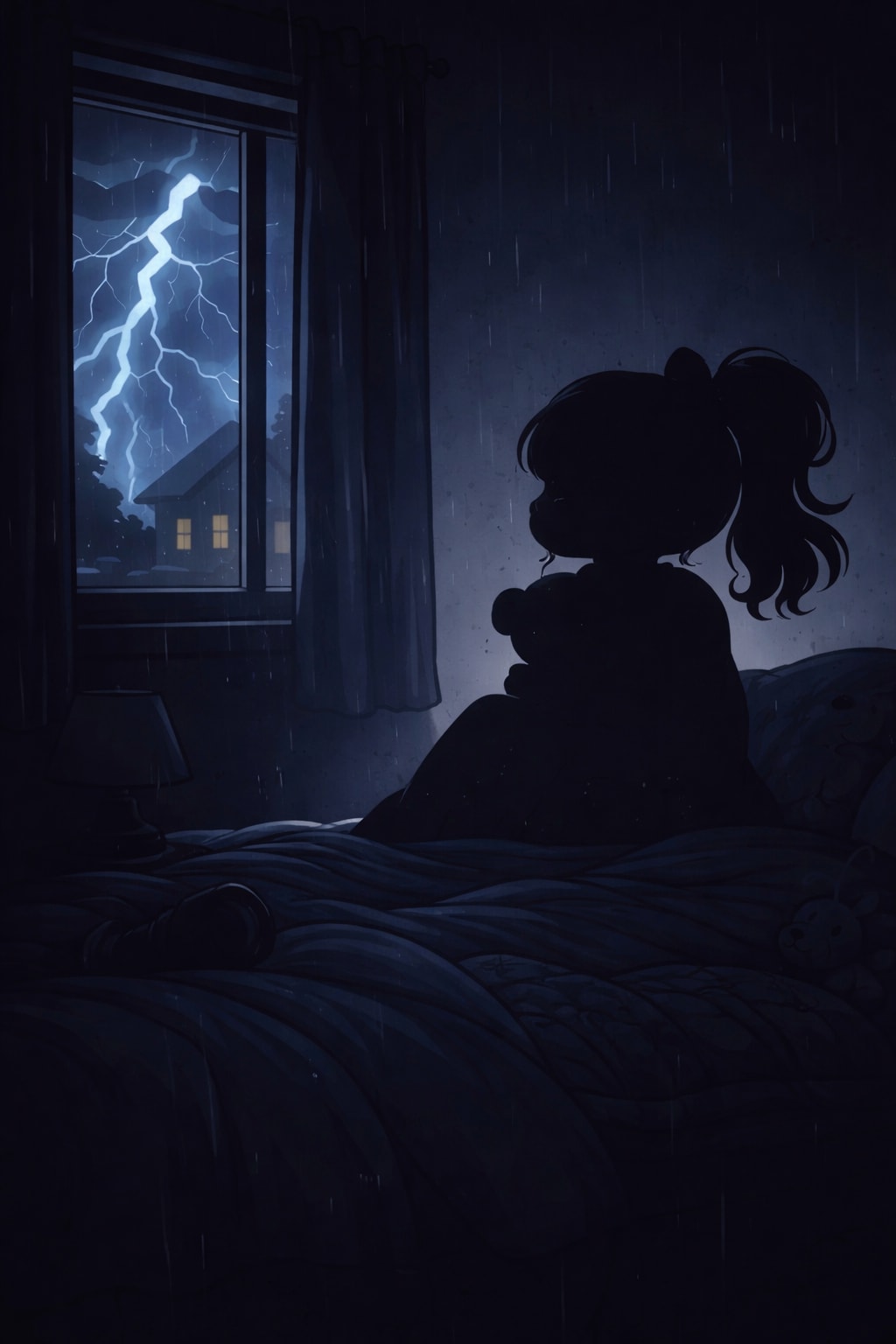 Suddenly as if out of nowhere a shadowy figure appears across the street below when a strong gust of wind rushes by. The girl tries to swallow her fear and run or hide but her feet seem unable to move away. The figure slowly looks up and smiles, its face lit up for just a second with the flash of lightning. The girl finally moves and in a panic she grabs the curtains and slams it down, almost shattering the window as she locks it! She rushes to her bed, lies down and shuts her eyes, trembling in fear!
