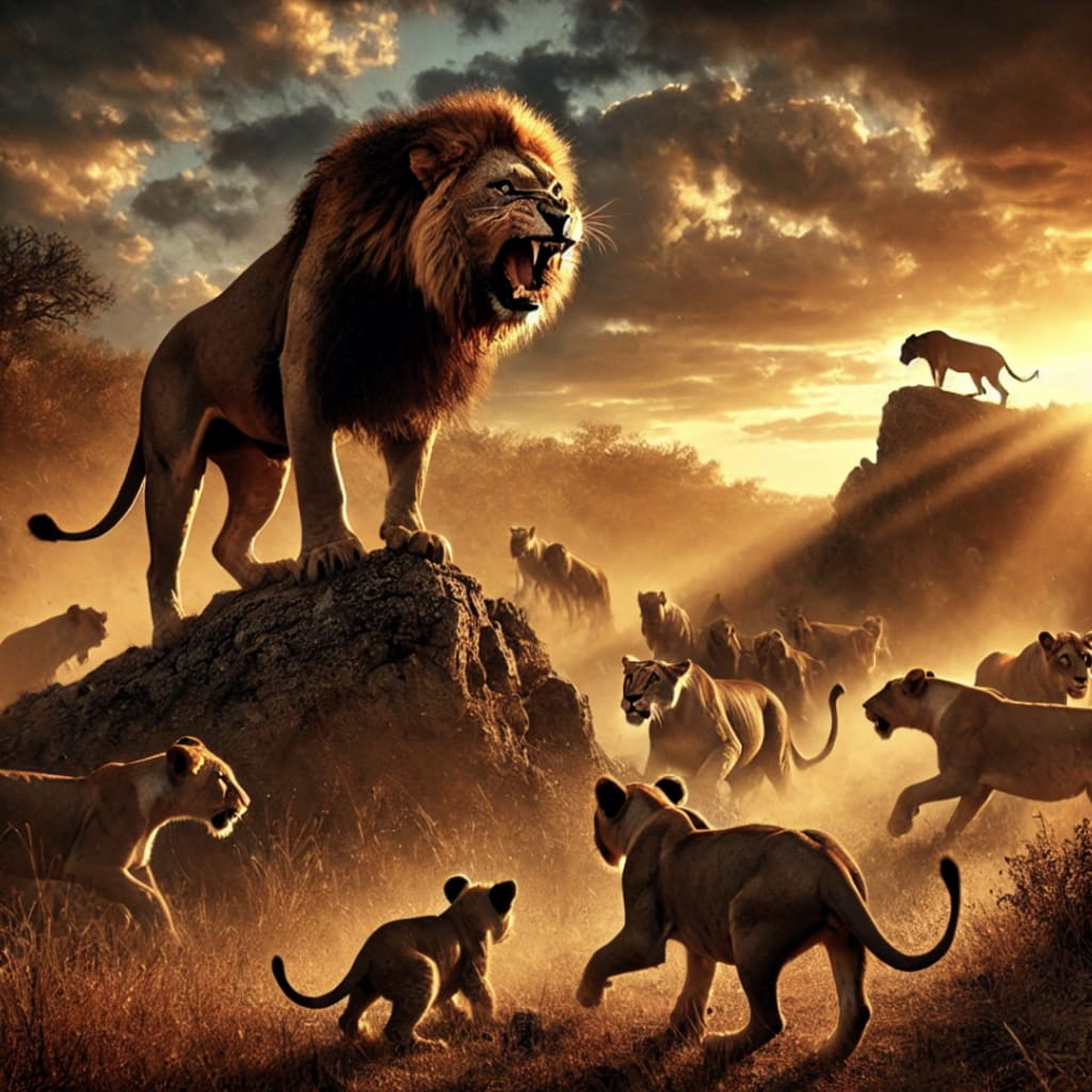 The golden African sun dipped low on the horizon, casting long shadows over the dry savanna. The air was thick with tension as Kano, the mighty leader of the Stormfang Pride, stood atop a small rocky hill, his amber eyes locked onto the threat approaching from the east.