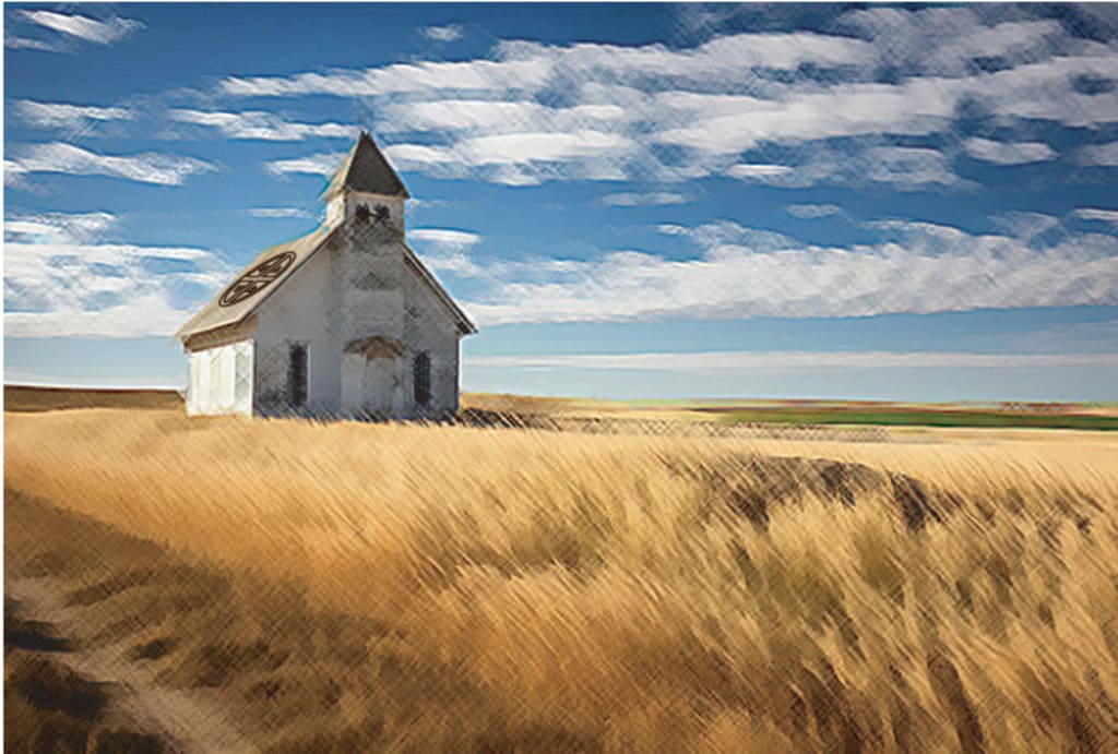 In the middle of a barren, dirt field surrounded by dying weeds sits an old, wooden church. It had a name once but it's been long since forgotten. The sign blew away during the great dust storms of ’38, and no one saw fit to replace it. Nowadays people around town just refer to it as God’s House. Its exterior is as dry and weathered as the surrounding flatlands. No cross hangs over the battered front door. No stained glass, or glass of any kind for that matter, glistens in its slender windows. They are heavily shuttered against the Kansas winds. The bell tower has no spire. It is merely a squat chimney perched ominously over the entrance. The bell within it is small and rusty and only rings when a twister comes knocking. Its sole occupant is only slightly younger than that church itself and he tends to it as well as any man of ninety-four years can manage. He is the Right Reverend Hyram Pinker and he is the oldest man in town.