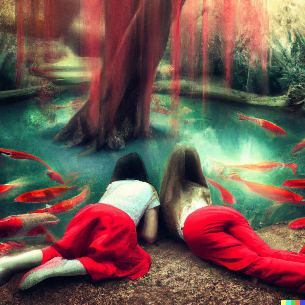 Janet, puffing comically, finally caught up to her. She collapsed onto the grass and leaned over the edge to peer into the stream, just in time to see the koi’s tail whip out of sight. “Argh!” She sighed dramatically. Turning back and lying flat on her back, she breathed deeply, trying to catch her breath.