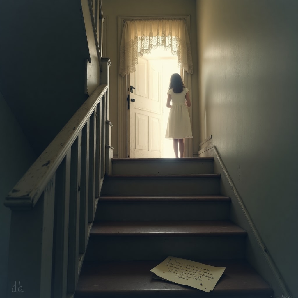 One evening, I woke up to find the light on in the hallway. Not a bulb. Just… light. Pale, like moonlight through gauze. And a shape — the outline of a girl.
