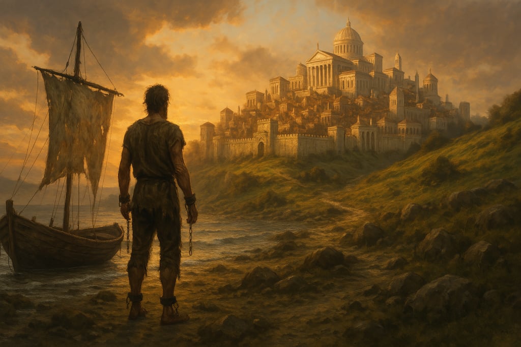 Darius landed on the rocky beach and fell to his knees, kissing the stones. Shackles still around his chains and feet, Darius walked into town.