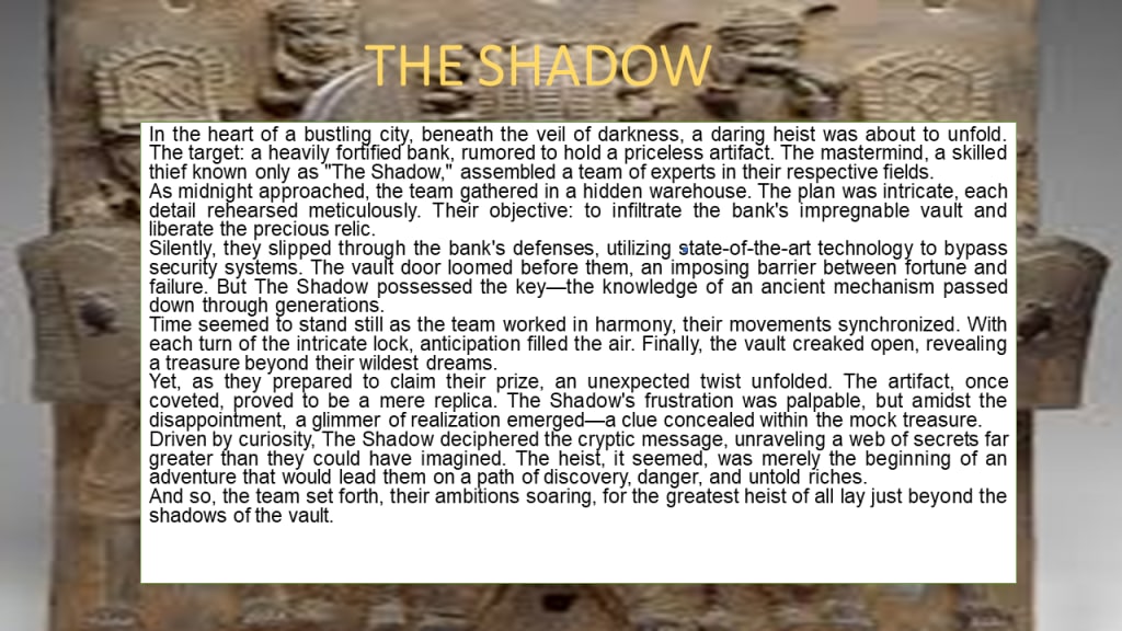 Driven by curiosity, The Shadow deciphered the cryptic message, unraveling a web of secrets far greater than they could have imagined. The heist, it seemed, was merely the beginning of an adventure that would lead them on a path of discovery, danger, and untold riches.