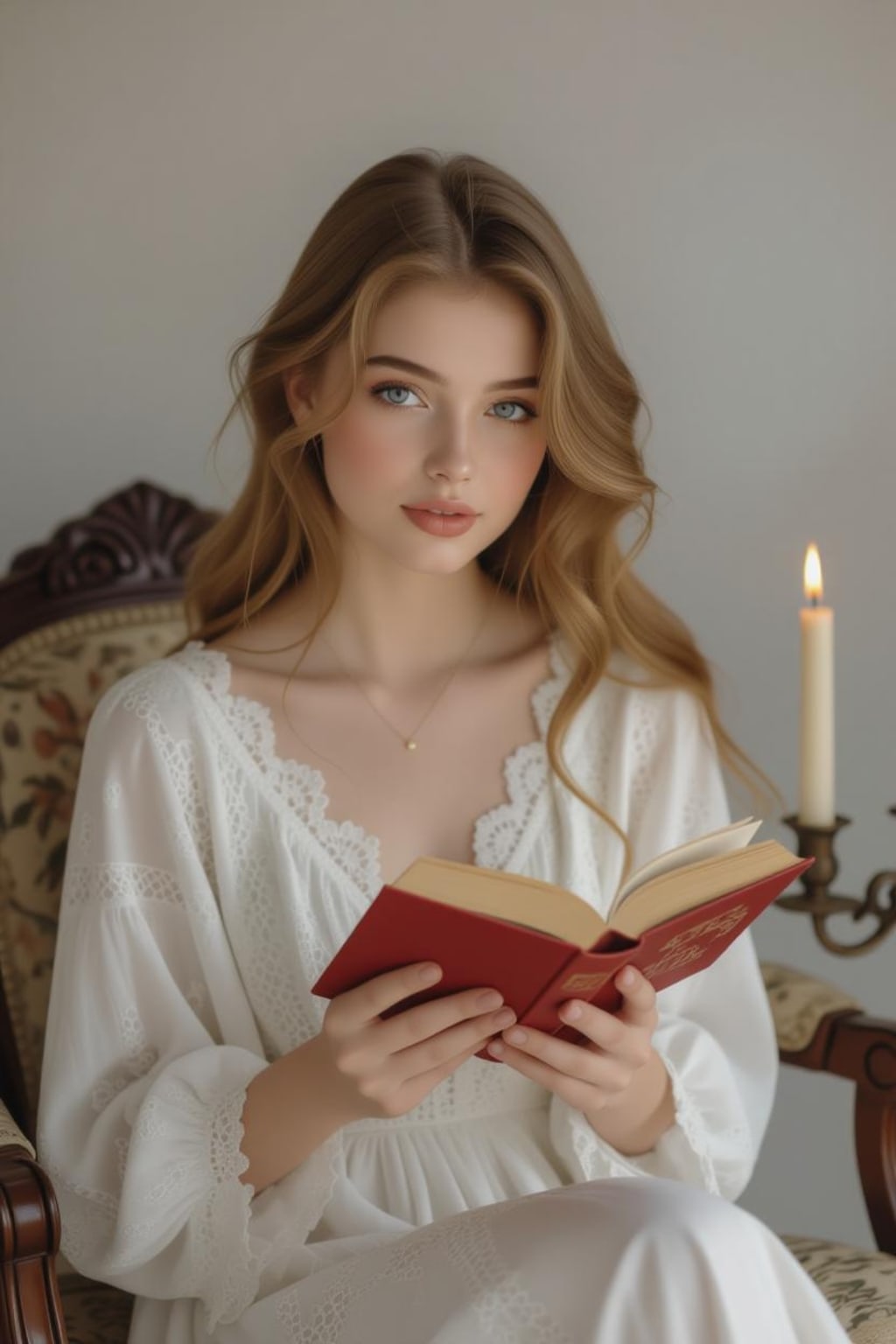 The autumn air of the outskirts carried the scent of damp earth and fallen yellow leaves, caressing the tall windows of Greenhall Manor. Its stone walls, once adorned with the grandeur of carved stones and vibrant paintings, now bore cracks and faded colors, whispering a silent tale of years steeped in solitude. Amid this heavy stillness sat Liovna, her golden hair shimmering like silk threads in the candlelight. Her white dress, with its delicate lace trim and voluminous sleeves, seemed to have stepped out of a distant dream into this cold room. The simple gold necklace at her throat—her only memento from her mother—trembled faintly with each breath.