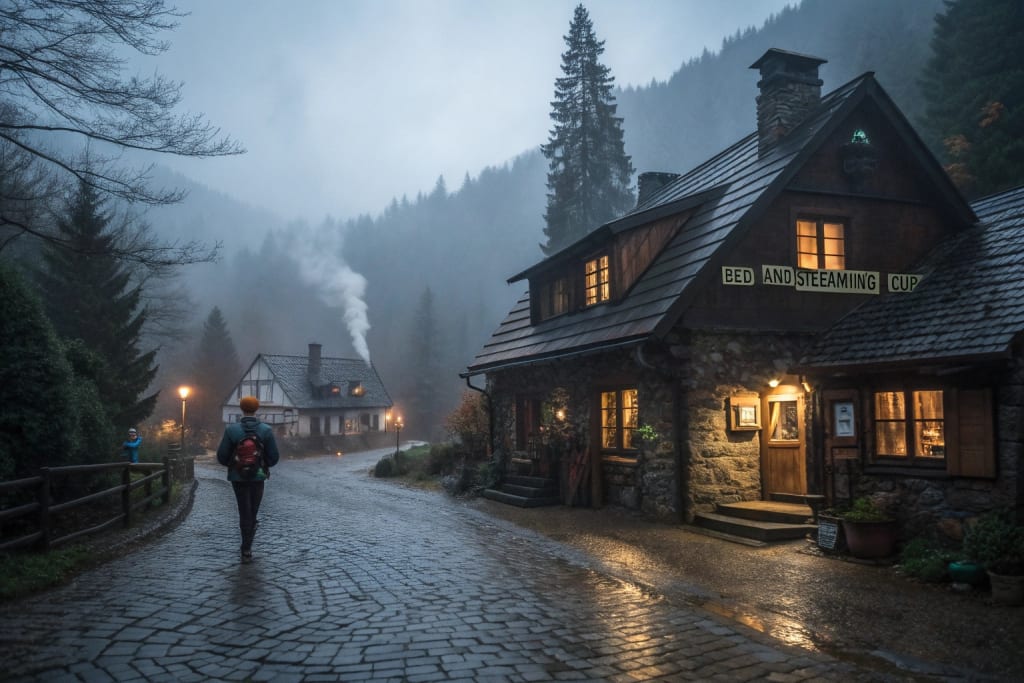 I fumbled for my hiking map, unfolding the soggy paper under the meager protection of a pine tree. There was no village marked anywhere near my location—nothing but wilderness for miles. Strange, but at this point, I wasn't about to question my good fortune.