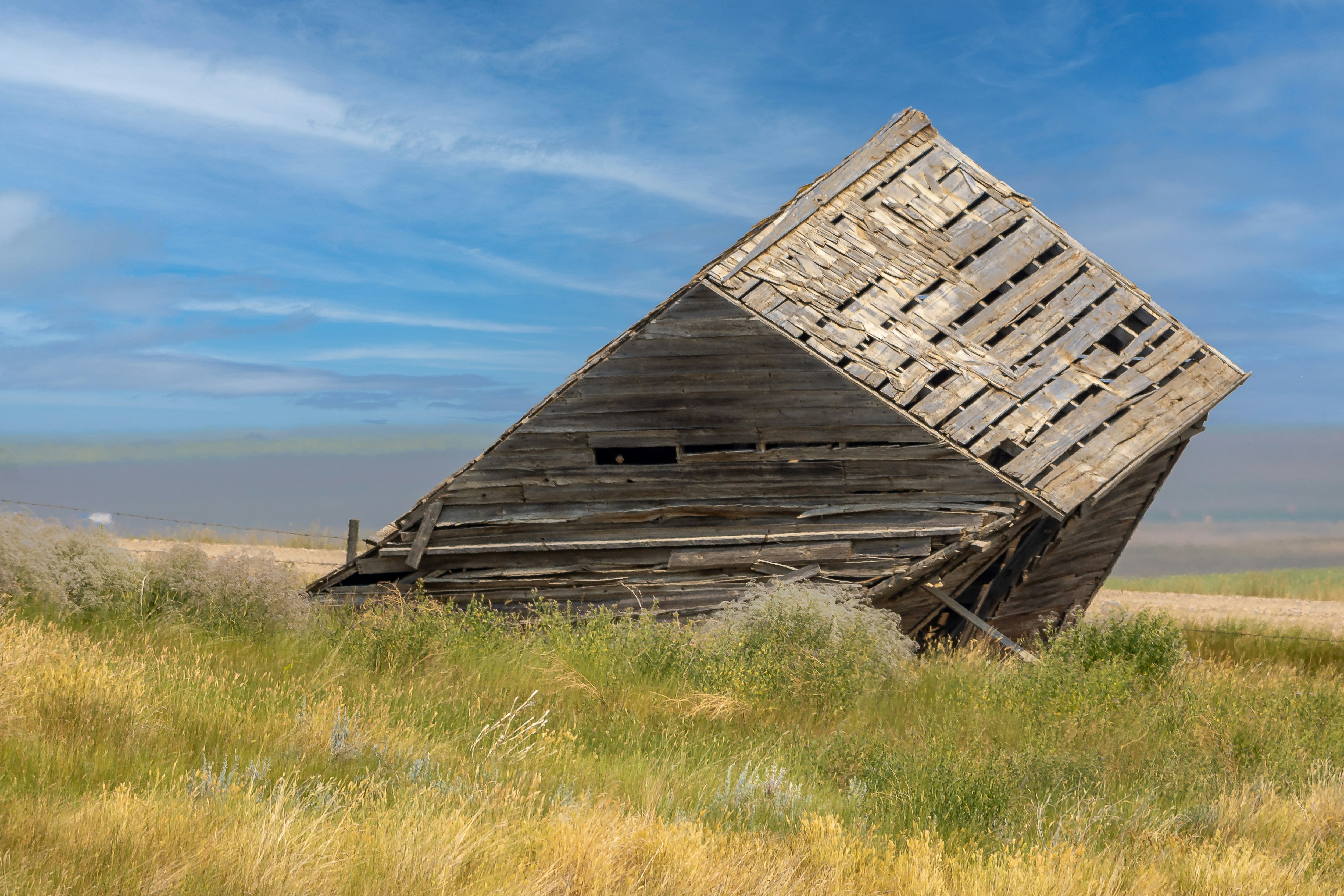From the outside, it looks to be in worse shape. It’s leaning hard to the right and much of its roof has caved in. Some of its siding is missing, the old boards either scavenged or peeled off by the wind. The barn isn’t a barn, not anymore. It’s a checkerboard of light and dark, caught between being and not.