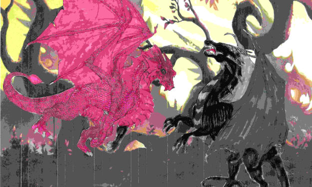 It was the huge, scaly creature that had found me firmly rooted to that spot, hot breath on my neck; looming over me, that had caused them to turn tail and run. I slowly turned around, fearful of what exactly I would see due to having only seen a giant, scaly foot next to me. The thing staring back at me was shiny and bright pink. It seemed odd to me since its foot was black. It had a long, pointed snout, big, round eyes that matched the color of its skin, and when it smiled at me, the teeth were as long as my arm. I was unable to scream or run. I could feel the scream welling up inside my chest but when I opened my mouth, nothing came out, not even a squeak. When I say it smiled at me, that is exactly what I mean, it smiled, and I was sure it was because it had found its dinner. To my surprise, and I must say, much to my relief, I in fact was not to be a meal that day.