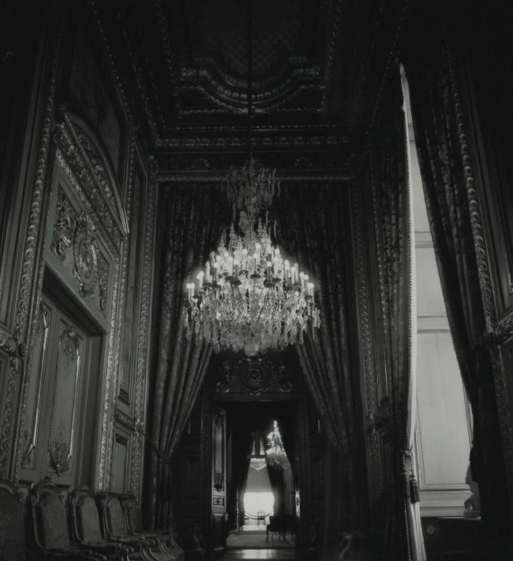 The interior however, portrayed more of the family’s opulent manners and splurges一Gilded bannisters on the spiraling staircase. Checkered floors with tall arched windows. The coffered ceilings were high and ornamented, and in the foyer, drooped an enormous crystal chandelier. Gothic scones perched on several wings of the crimson red walls gave the corridors a soft bright glow. All in all, it lived up to the magnificence of its formal residents.