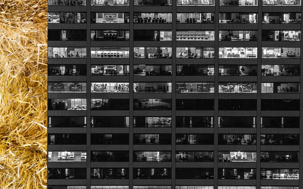 The loose straw in the corner is curious. Glancing over it, he finds he can trick his mind into seeing faces among the shadows. He isn’t sure whether the former owner—owners?—had left it all here on the ground out of some intention of the transaction or if it was just an assumption of setting, like a light fixture, a shower curtain. Nor, for that matter, did he know what straw—hay?—was even used for in the first place. Are animals involved? Who was it that he had argued with decades ago about the decision to adopt a dog. Odd that so many arguments, so many struggles, concern the self-made illusion of a delayed reality that never quite arrives: the shift from working more often to less, the looming question of relocation. Movement from somewhere bustling to somewhere more quiet, was the common talking point between them. Packed into identical apartments a bus ride away, monuments to minimalism, or else plucked down the freeway past toll booths between stretches of bumper-to-bumper, because We Could Have a Yard. Not unlike strands of straw bound into bales, the two of them, back then. Everyone, for that matter. Were there bales resting along the walls here, before, and was there a third meaning for the word ‘bale’? His own life trajectory seems like a line leading him to this late afternoon of déjà vu. In fact, it had been a collision between two illusions, actually, like the intersection of two winding streets that met once, but too early on to ever lead to the same far-off place reliably. There is only a single toll booth in the sixty mile northwest-southeast stretch between his skyscraper and his straw. He calculates how many rolls of quarters he should ask for at the bank each month, average number of trips times fourteen times two—there and back—with forty quarters per roll so perhaps three rolls to be safe. A future problem, imagined and solved. When You Say ‘Make a Mental Note’: That Bugs Me. The strewn straw, like the dead prairie grass outside, was a version of carelessness so novel to him that he remains frozen, comparing the scene to yellowed ethernet cables abandoned on the floor of his office after the harsh walls of the server room had been otherwise stripped ahead of renovations. He kicks his heel uncertainly at the dust of the structure. How could he have known his own direction, that the destination he defended would not persist, that she might have been standing right here. Their intersection had occurred too early. The idea is to take as few trips back as possible but best to ask for three rolls of quarters just to be safe. So that he can continue undeterred.