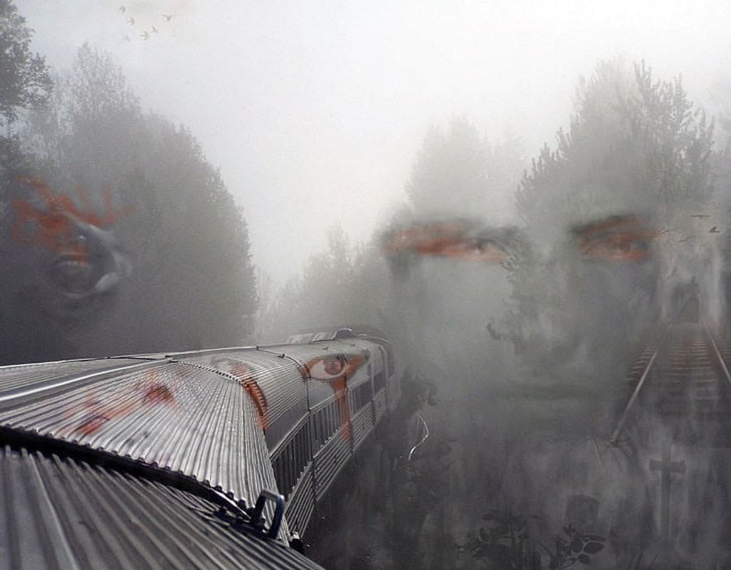It had been a long day at the office and Diana clocked out she said goodnight to the security guard, and proceeded to the garage area of the base, where she noticed something strange... the lights that usually brightens up the night, but tonight was different as she sensed something sinister in the stillness of the night. She got into her car and started the ignition when she heard noises escaping from the dark shadows that darted from wall-to-wall clinging to the darkness, edging along the emptiness of the night, when she saw four menacing eyes that glowed bright grayish orange glaring at her with growling and the grinding of what seemed like a million teeth. She awoke from bouncing movement and her head hurt as she grabbed her temples sitting up looking around.... what the hell happened wait... what...where am I? As the fogginess began to leave, she realized she was on a train- but why? How long had she been there and where was the train headed? So many questions with little to no answers.... She began looking around, but seeing no one h, hearing nothing, but the train racing along the tracks at speeds that seemed to quicken as fear gripped her, wrenching into the depth of her soul. As she pulled herself up to stand she began walking through the train in order to get some answers, but as she moved from car to car she saw no-one and the further she moved through the train the more colder and desolate the belly of the train became...she made it to the engine area and for a brief moment saw, well thought she saw the conductor sitting steering the train, but as she get closer and closer the more transparent the figure seemed until once inside the engine area there was no-one else as she was looking at the gears she noticed that the speed the train was moving at 98mph and speeding up at what seemed too fast, she heard noises behind her that caused her to jump and breathe harder all the lights were out except in the engine room, she grabbed a flash light and began walking slowly back through the train- the trains’ cars began filling with mist almost like a thickening fog, as if someone had left all the windows open within the train, but when she looked out through the mist she couldn’t see any fog, actually she saw no building, no trees, nor mountains just pitch darkness and wait...She screams as ghostly mirages surfaced keeping with the speed of the train, she fell to the floor not knowing or understanding the implications of what was out within the darkness. Her mind racing “this can’t be real, where the Hell am I..." As something wet touches her hands, she flashes the flashlight and looking down she saw pools of blood raising the light up there stood in front of her something with a twisted appearance as rotten flesh dripping through the train with every flickering movement, Diana scrimmaged as fast as she could back to the engine room where the only light existed, screaming with fear and dismay! The thing chased her as she scurried into the lite room it grabbed at her piercing her flesh with a touch of death and when it grabbed her ankle she felt a chill she had never known before and as the light from the car touched it, the phantom like thing screeched and let go- she began feeling ill and she started to go into convulsions and she could see what it wanted, what it was , and how she ended up there.