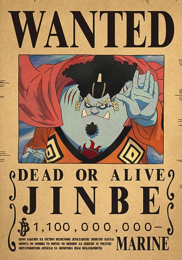 Jinbe, also known as the "Knight of the Sea," is a fishman and the helmsman of the Straw Hat Pirates. He has incredible strength and endurance, as well as the ability to communicate with sea creatures. Jinbe is calm, level-headed, and highly respected by both his crewmates and other pirates. He has a deep sense of justice and has fought against the World Government to protect his fellow fishmen. Jinbe's dream is to create a world where fishmen and humans can coexist peacefully. He is a valuable addition to the Straw Hat crew, providing both strength and wisdom.