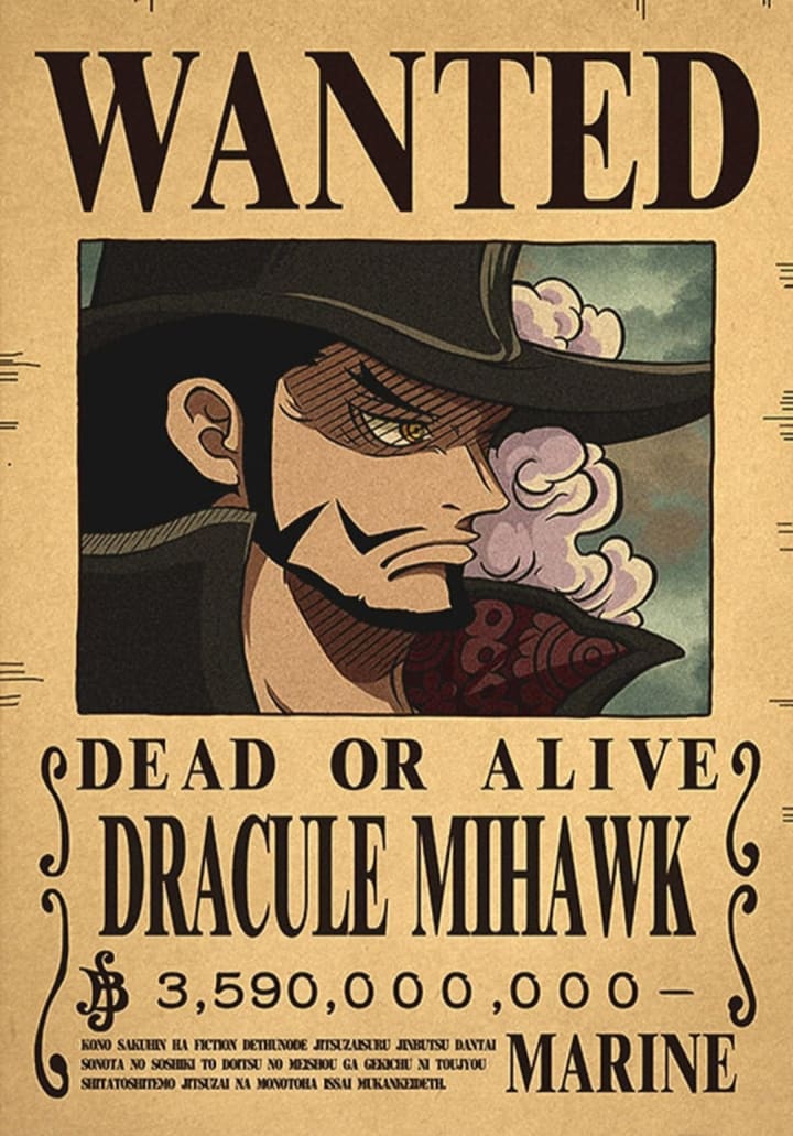 Dracule "Hawk Eyes" Mihawk is a Warlord of the Sea and one of the most powerful swordsmen in the One Piece series. He is known for his incredible skill with a sword, particularly his use of the black-bladed sword Yoru. Mihawk is also known for his aloof and stoic personality, rarely showing emotions or concern for others. Despite this, he has a code of honor and respects other strong swordsmen. Mihawk is a former rival of the pirate Shanks, and has clashed with the Straw Hat Pirates on multiple occasions. He is a formidable opponent and a valuable ally to those he deems worthy.