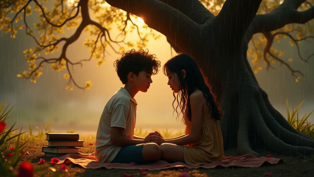 One rainy evening, they sat under the old banyan tree near the campus library. She was shivering from the cold. He took off his hoodie and handed it to her.