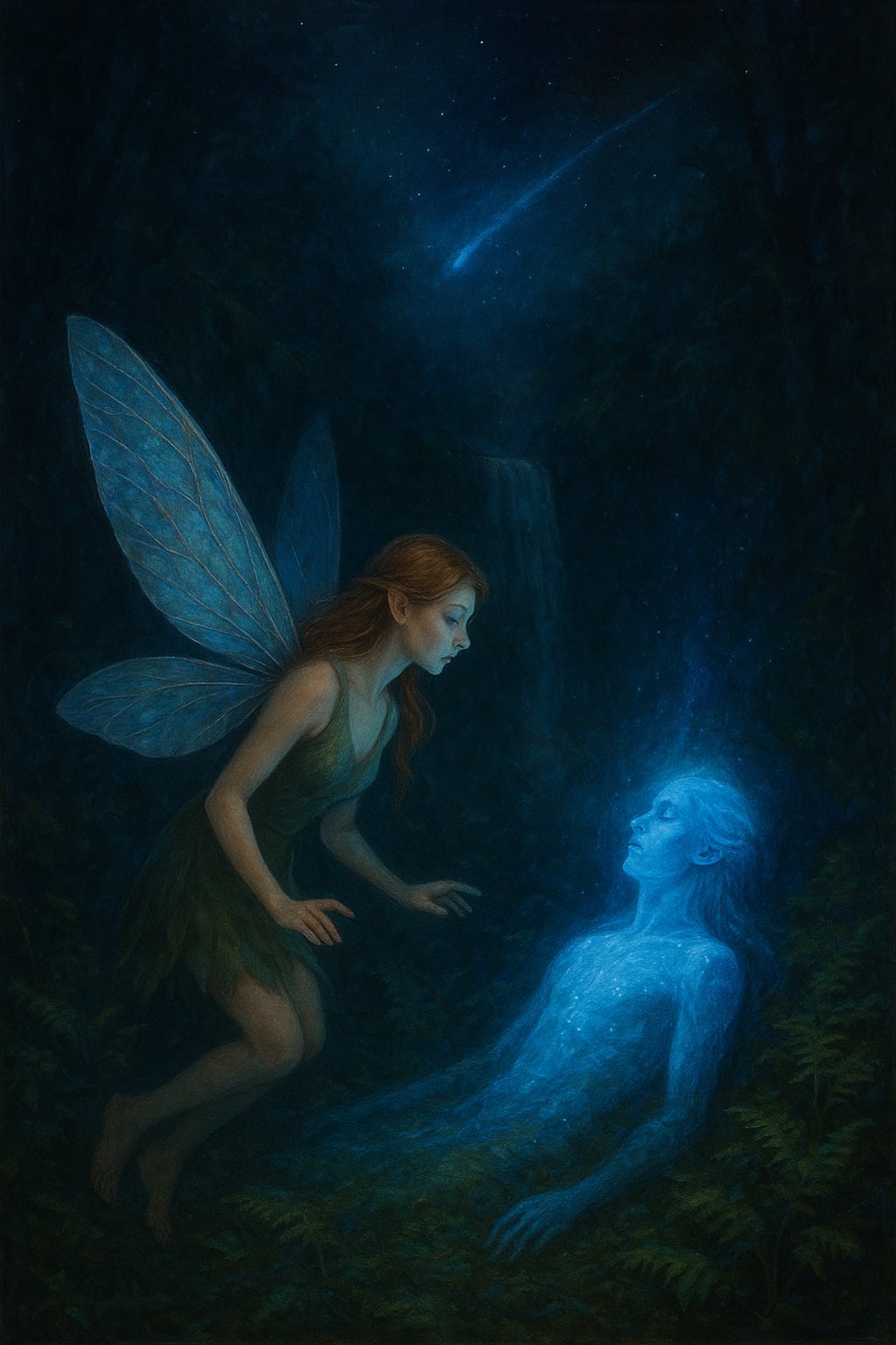 In the glowing crater lay Aethan. He was not a fairy. He was tall, luminous, and heartbreakingly fragile, like a piece of the midnight sky that had shattered. His light was fading, pooling away like water.