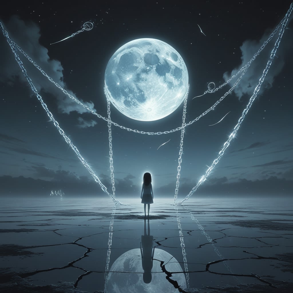 Each night, Mera returned. The dream was always the same. A ruined temple of bone and dust stood beneath the suspended moon. Blackened chains anchored it to invisible corners of the dreamworld. And always, a figure waited at the temple’s steps: a child made of stars.
