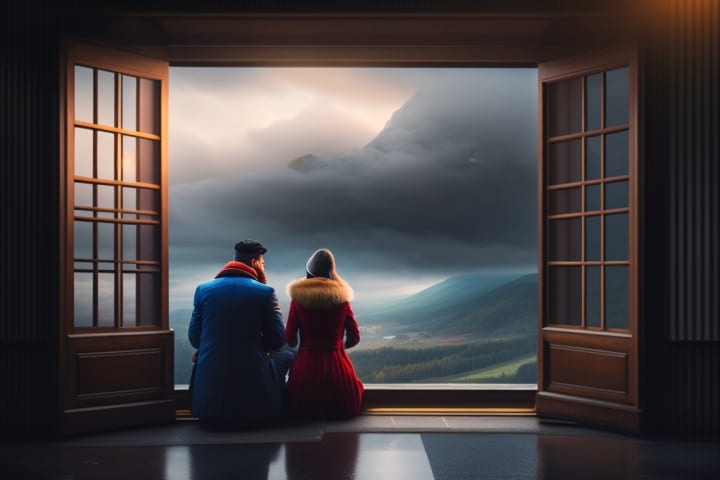 Sitting by the window, their eyes met, and a tender, tranquil smile graced their lips, hinting at hidden warmth within. The man's gaze, filled with tenderness, spoke volumes without uttering a word. Raindrops fell, casting a soothing rhythm against the glass, as he disappeared briefly and returned with two steaming cups of tea. He extended one to his beloved, her eyes filled with gratitude.