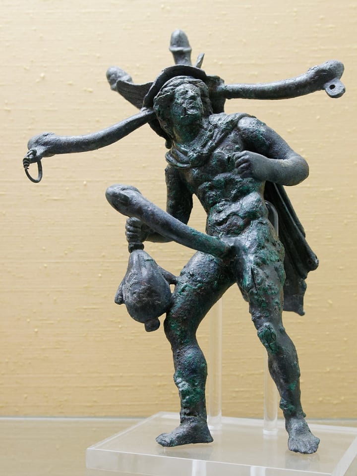 This tintinnabulum depicts the God Mercury with multiple giant erections growing from his head, in addition to one in the anatomically-correct location. Three of his penises originally sported chains with tinkling bells, now lost.