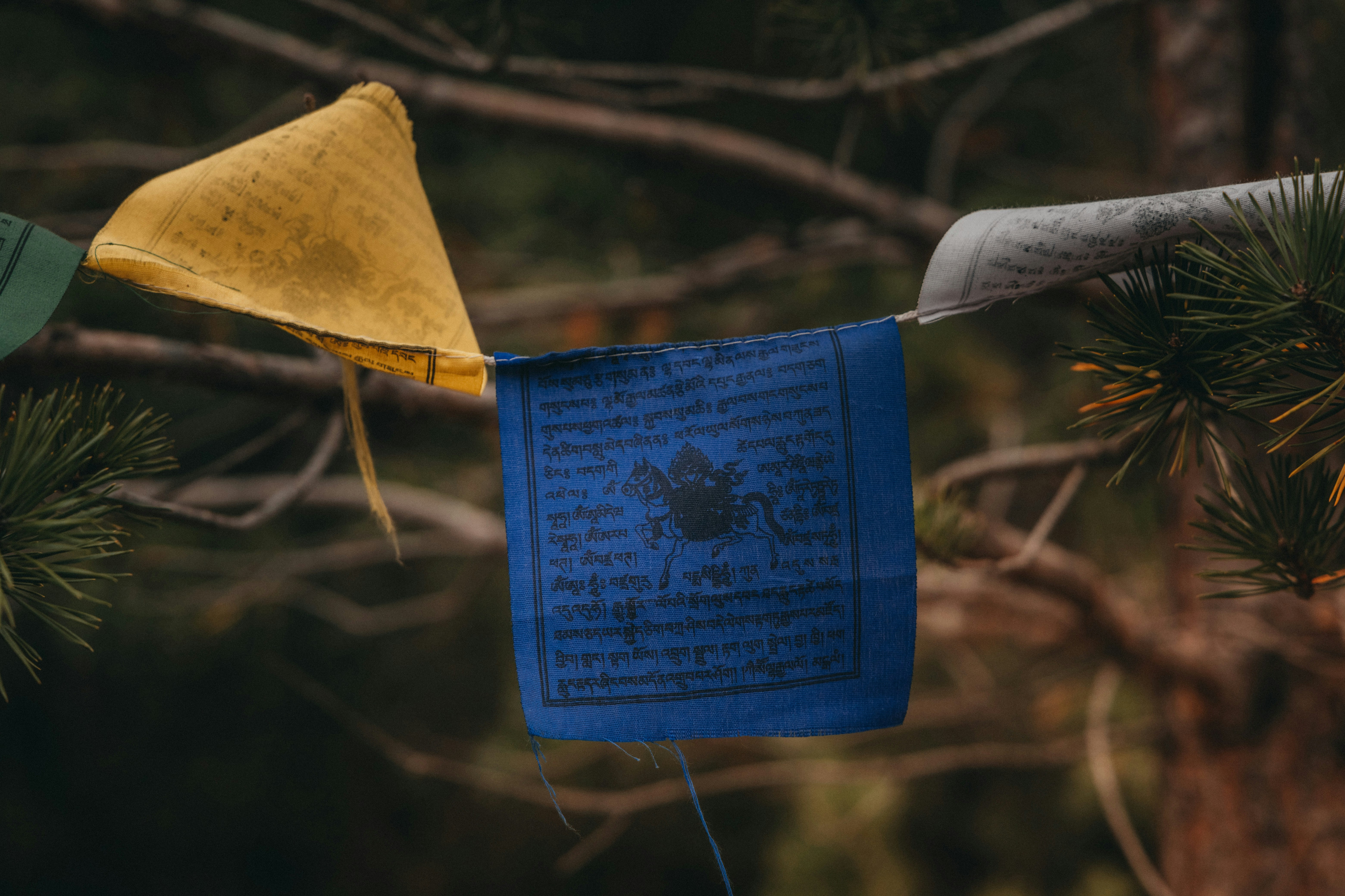 Tibetan prayer flags are bright and beautiful, but their colors aren't just for show. Each hue signifies an element — and the flags are always arranged in a specific order, from left to right: blue, white, red, green, yellow. Blue represents the sky, white represents the air, red symbolizes fire, green symbolizes water, and yellow symbolizes earth. All five colors together signify balance. They also represent directions – North, South, East, West, and Center.