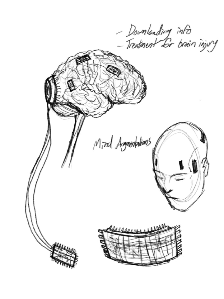 I guess people could put parts or devices in their brains too. They could put these tiny computer chips in their heads and it made them smarter. Some people got better vision too. They used machine eyes or chips in their brains. Sometimes both. I saw this on the screen and wanted to catch everything it showed. I wonder how much smarter he was after they put those in his head.